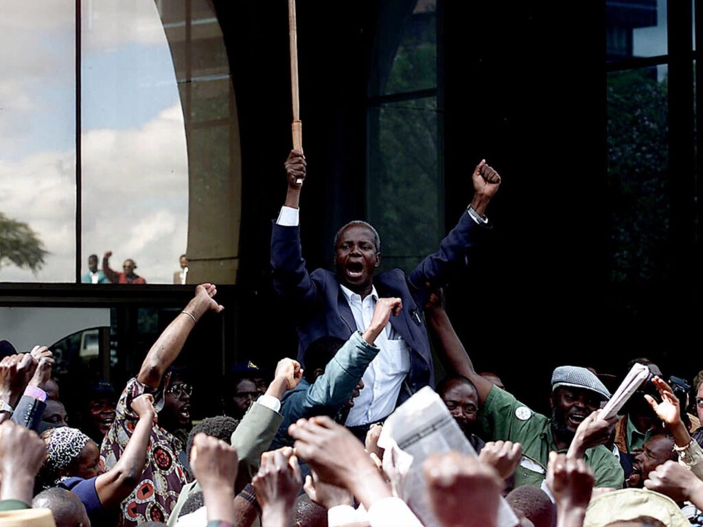 El líder de los veteranos de la Guerra Nacional de Zimbabwe, Chenjerai «Hitler» Hunzvi, es retenida por los veteranos de guerra, antes de dirigirse a ellos fuera de las oficinas de Zanu PF en Harare, Zimbabwe, el sábado 29 de abril de 2000. Al menos 27 trabajadores agrícolas fueron atacados durante la noche, menos que un día después de que los líderes agrícolas y los representantes de los escuadrones blancos de la granja llegaran a un acuerdo que la violencia de la violencia de la violencia de la violación de la granja. (AP Photo/Themba Hadebe)