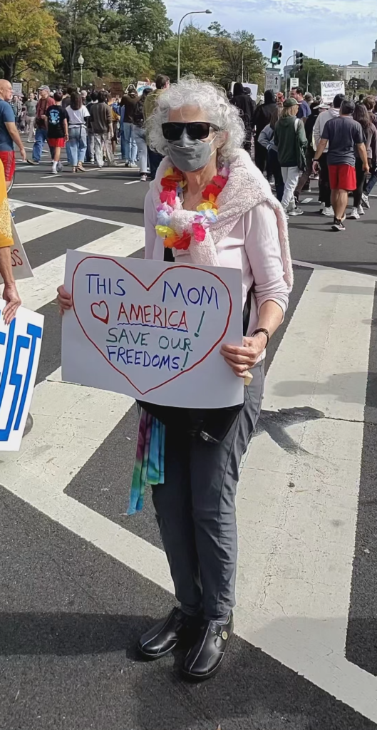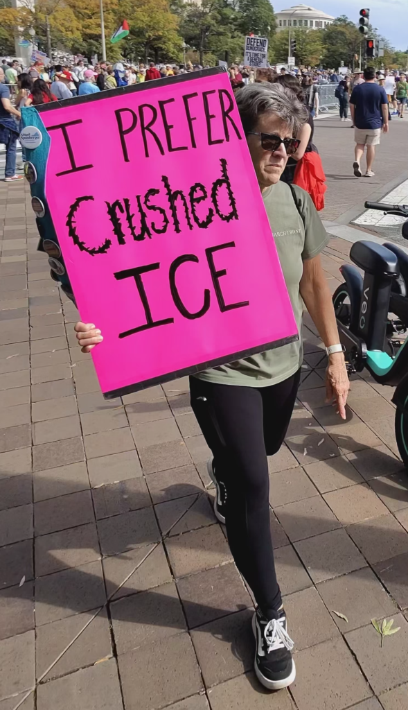 Activista de izquierda camino a asistir a la protesta “No Kings” en Washington, DC, el sábado 18 de octubre de 2025. (Matthew Perdie / Breitbart News)