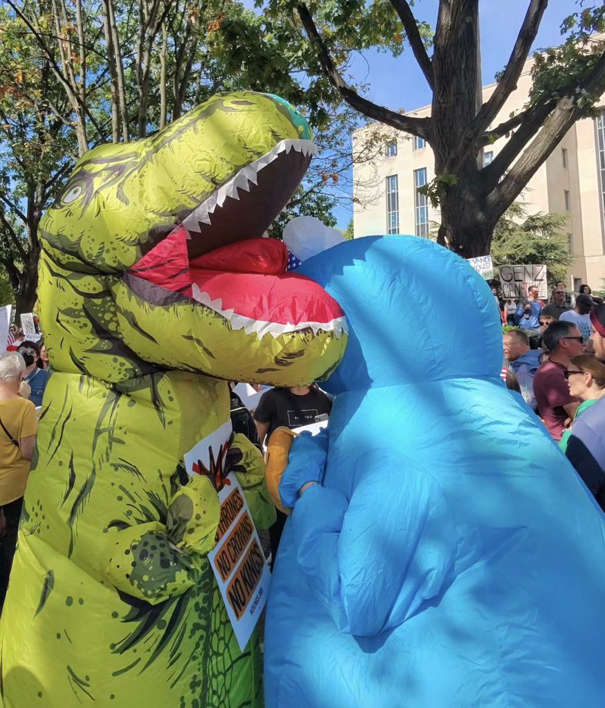 El uso de disfraces de animales inflables es una tendencia reciente entre los activistas que comenzó como respuesta a que la administración Trump persiguiera a los izquierdistas violentos, con la intención de contrarrestar la narrativa de disturbios violentos tratando de parecer lo más inofensivos posible. Por supuesto, como ocurre con la mayoría de las estrategias que emplean los activistas de izquierda, termina haciéndolas parecer extrañas y espeluznantes, y la retórica violenta parece sobrevivir en carteles sin oposición a pesar de las intenciones expresadas por los organizadores.