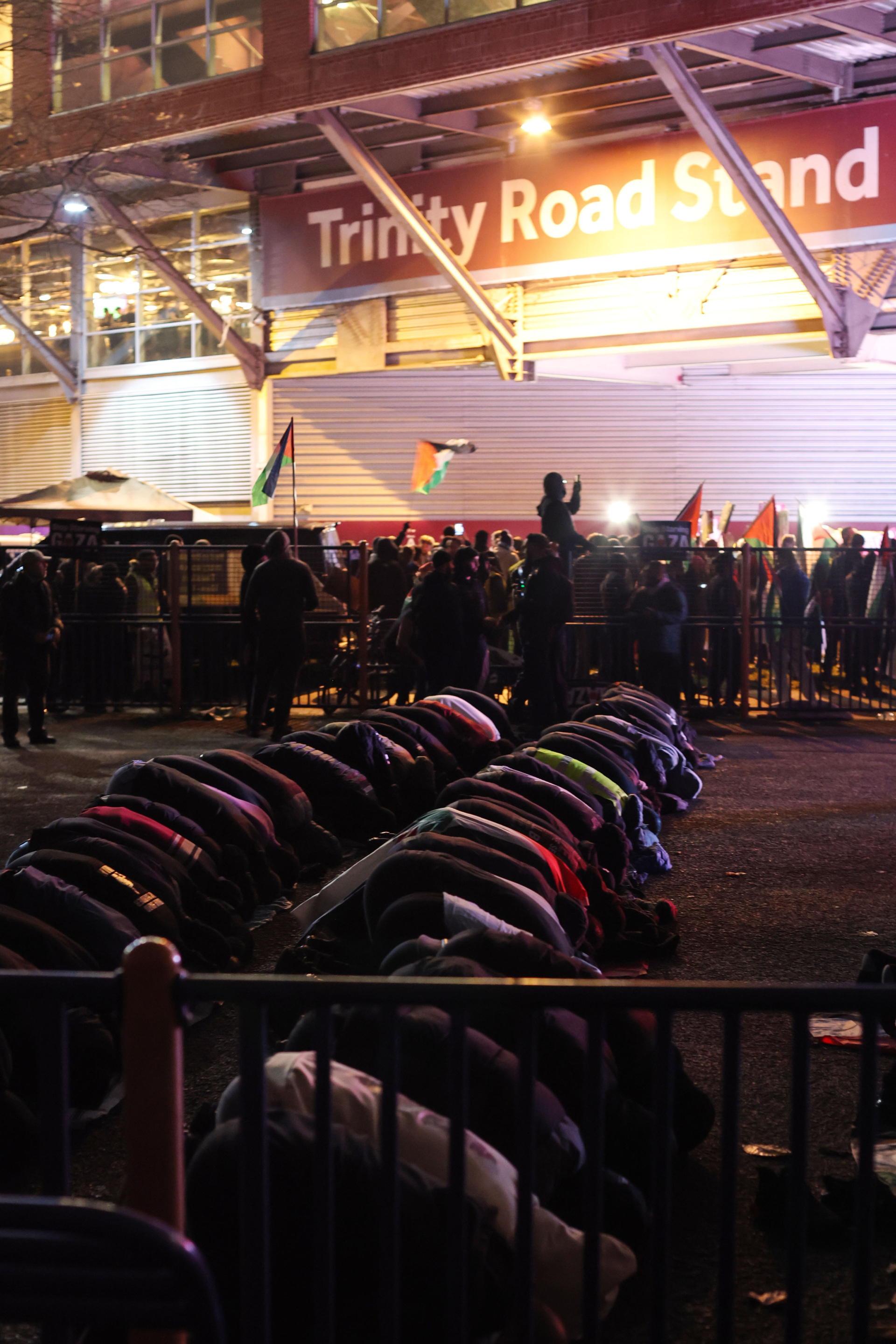 BIRMINGHAM, INGLATERRA – 6 DE NOVIEMBRE: Hombres musulmanes realizan su oración vespertina en las afueras de Villa Park antes del partido de la fase MD4 de la Liga Europa League 2025/26 entre el Aston Villa FC y el Maccabi Tel-Aviv FC en Villa Park el 6 de noviembre de 2025 en Birmingham, Inglaterra. (Foto de Charlotte Wilson/Offside/Offside vía Getty Images)