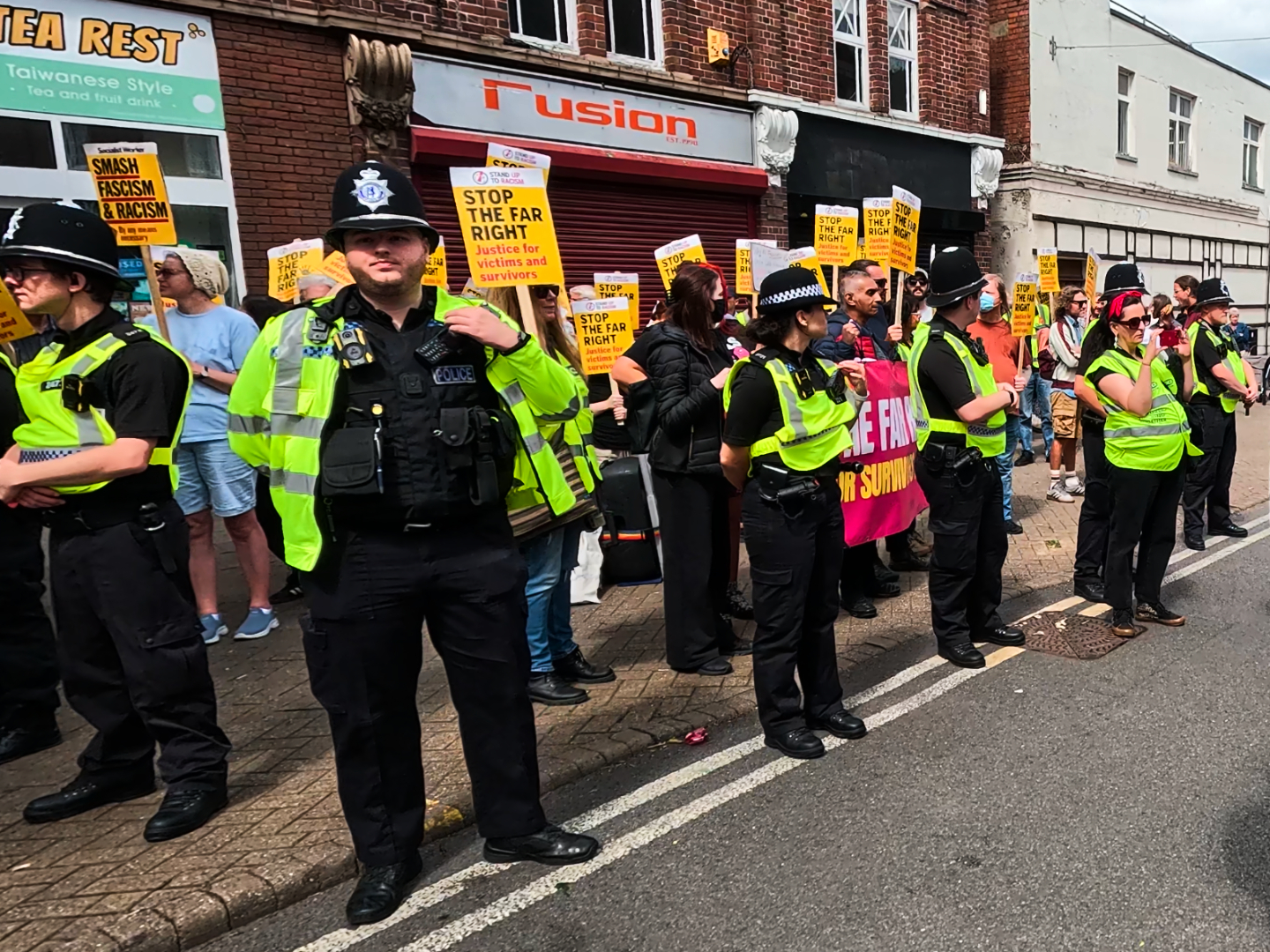 De pie con los activistas del racismo se reúnen en oposición a la protesta contra la violación anti-hijos en Nuneaton, Inglaterra. 9 de agosto de 2025. Oliver Lane, Breitbart News