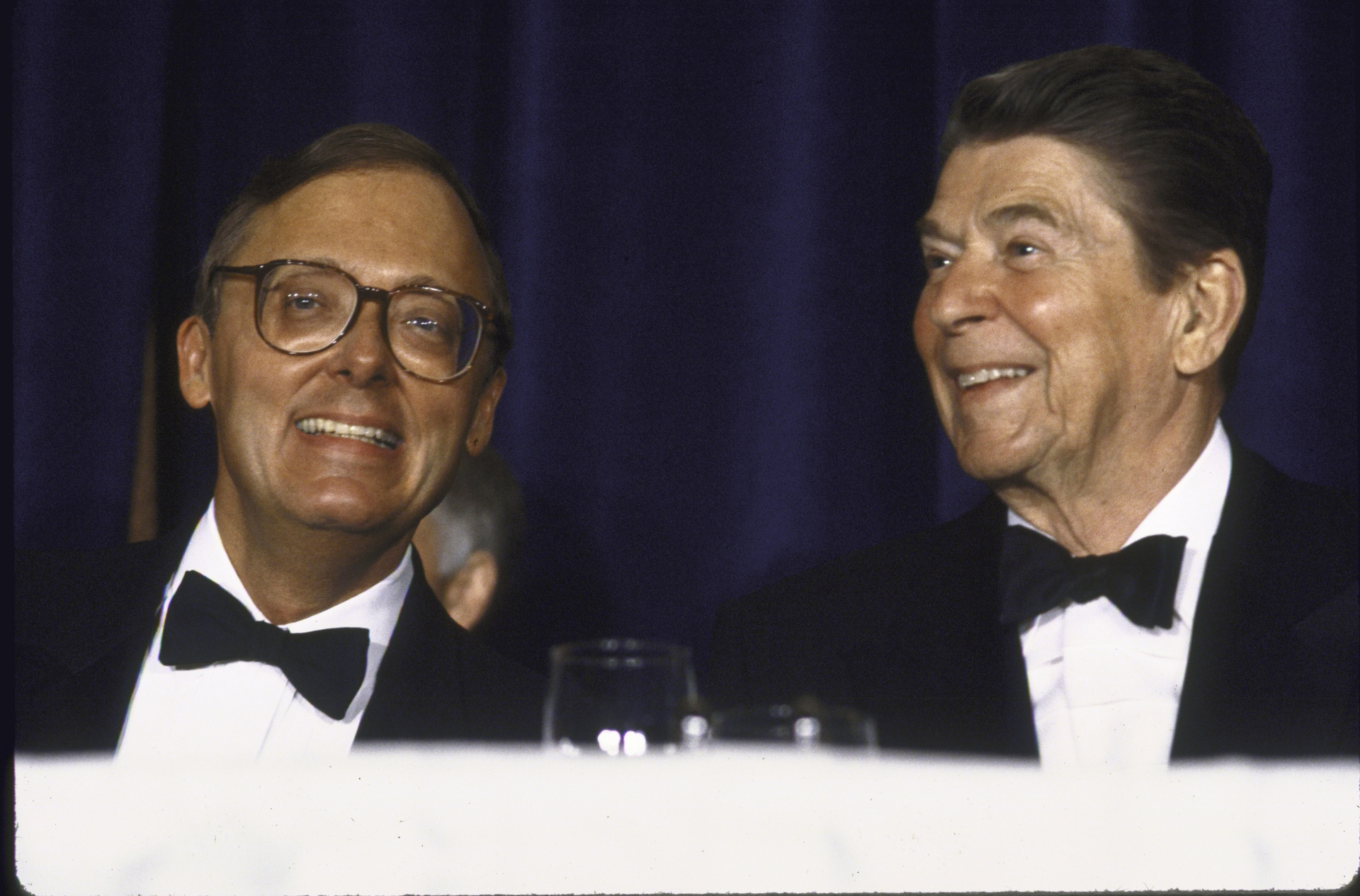 El presidente Ronald W. Reagan (derecha) con el presidente de la Fundación Heritage Edwin J. Feulner, Jr. durante una función de la Fundación Heritage en 1986. (Diana Walker/Getty Images)