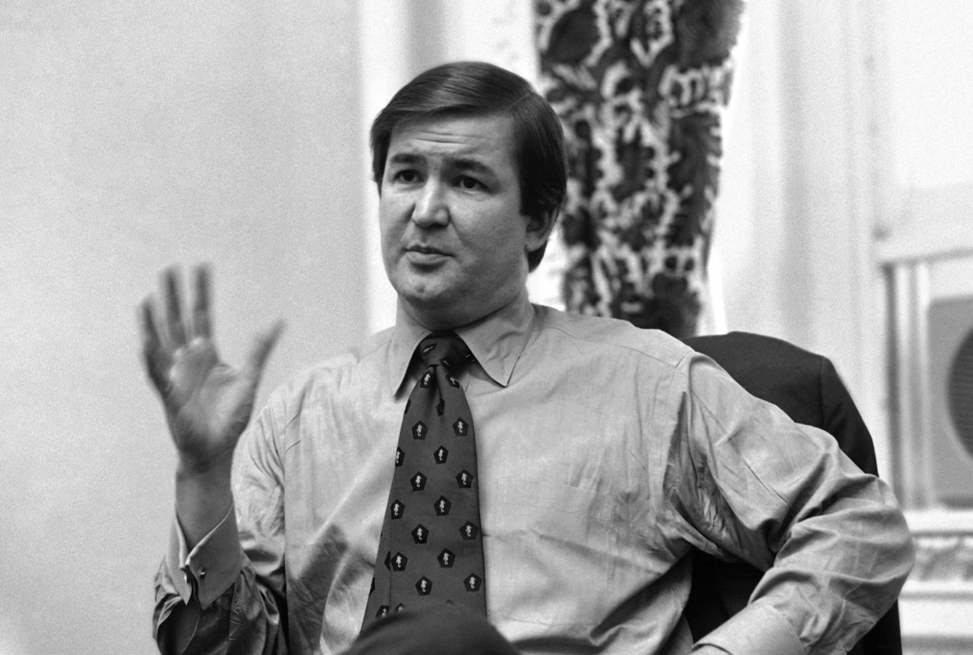 El escritor de discursos presidenciales de Nixon, Patrick Buchanan, habla en una sesión informativa de noticias en Washington, DC, el 14 de mayo de 1974. (Foto AP)