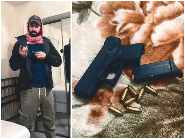 (Izquierda) Mahmoud Amin Ya’qub Al-Muhtadi fotografiado manejando un arma de fuego en su residencia en Tulsa, Oklahoma. (R) La Glock de Al-Muhtadi con munición. (Departamento de Justicia)