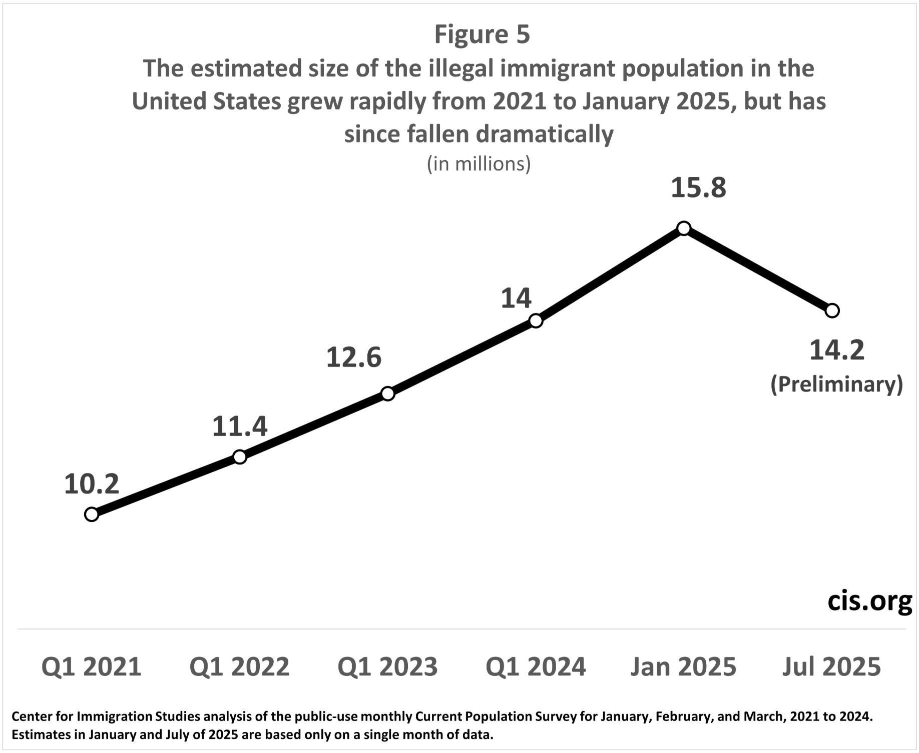 Estimamos preliminarmente que La población inmigrante ilegal disminuyó un asombroso 1.6 millones (10 por ciento) a 14.2 millones De enero a julio de este año. (Énfasis agregado)