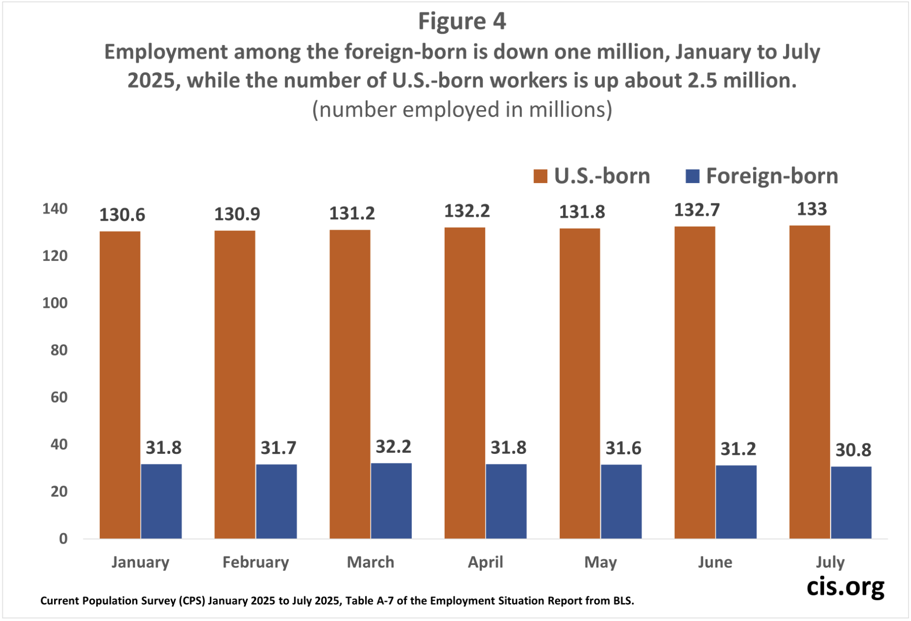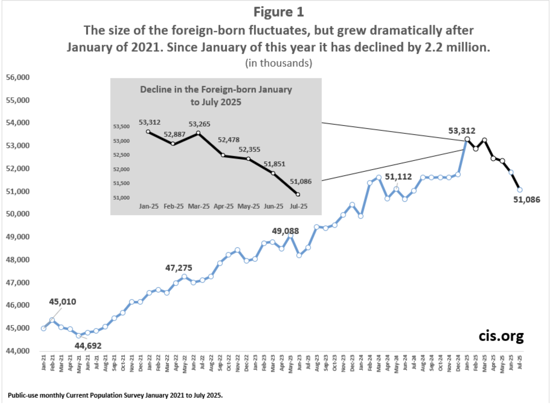 En un análisis De los datos de la Oficina de Estadísticas Laborales, los investigadores de la CEI Steven Camarota y Karen Zeigler descubrieron que entre enero y julio, Trump ha supervisado una disminución «sin precedentes» de 2.2 millones de personas en la población total de origen extranjero de la nación, 1.6 millones de los extranjeros ilegales.